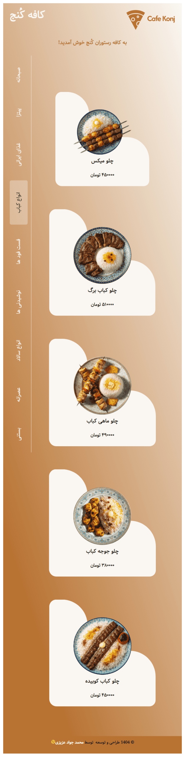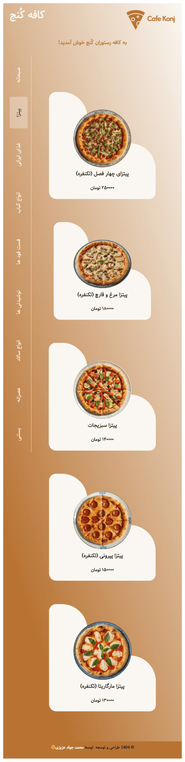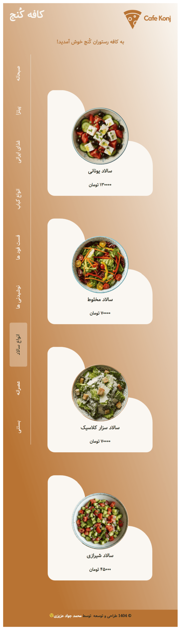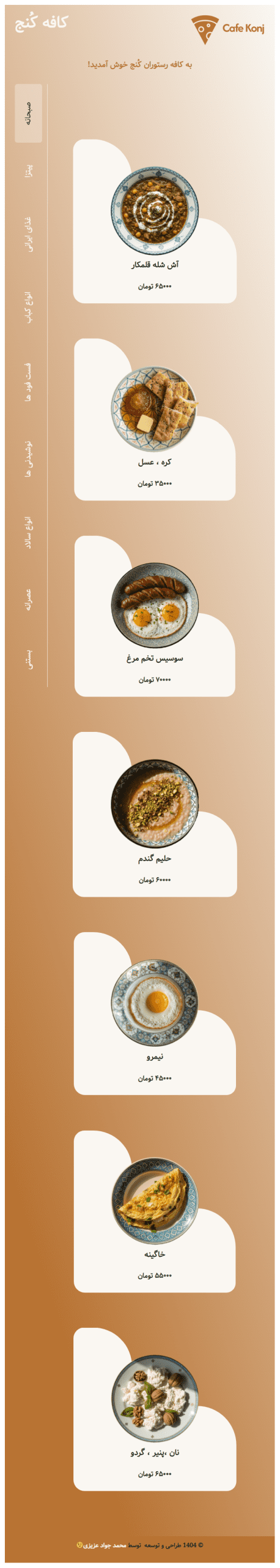 این سایت برای «کافه رستوران کنج» طراحی شده تا منو، نوشیدنیها و میانوعدهها را بهصورت حرفهای به مخاطبان معرفی کند. طراحی با تمرکز بر وضوح اطلاعات، تصاویر جذاب غذاها و تجربه کاربری ساده انجام شده تا بازدیدکننده بهسرعت با تنوع غذاها، قیمتها و سبک سرو آشنا شود. 🍽️☕🍰